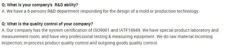 SGS, ROHS, IATF16949:2016 või kolmanda osapoole kontroll on saadaval vastavalt kliendi soovile. |